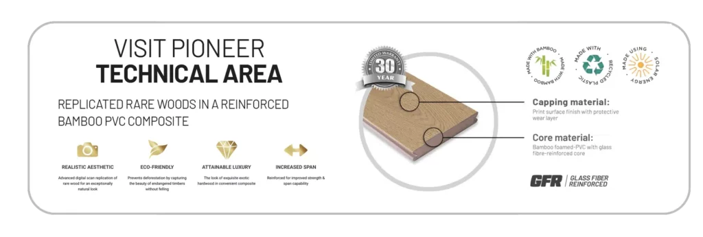 Pioneer redefines what composite decking is by capturing the soul and beauty of hardwoods in every grain and hue. Engineered with next-generation technology, it delivers the timeless look of natural timber for decades to come.